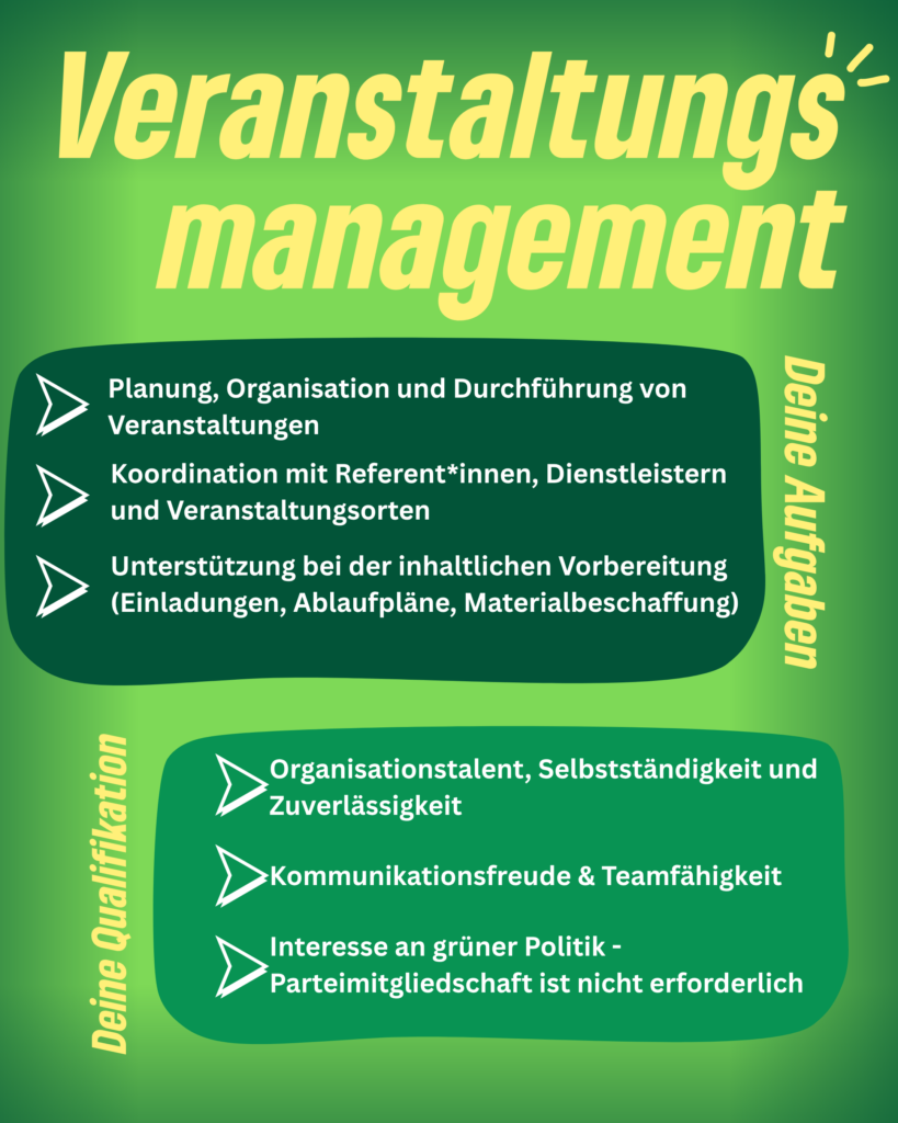 🔥Wir bieten dir eine sinnstiftende und abwechslungsreiche Tatigkeit mit leistungsgerechter Bezahlung und flexiblen Arbeitszeiten. In einem spannenden Aufgabenfeld mit politischem Bezug kannst du mit einem engagierten und herzlichen Vorstandsteam zusammenarbeiten und hast die Chance, dich intensiv mit grüner Politik auseinanderzusetzen und bei Aktionen und Wahlkämpfen mitzuwirken!