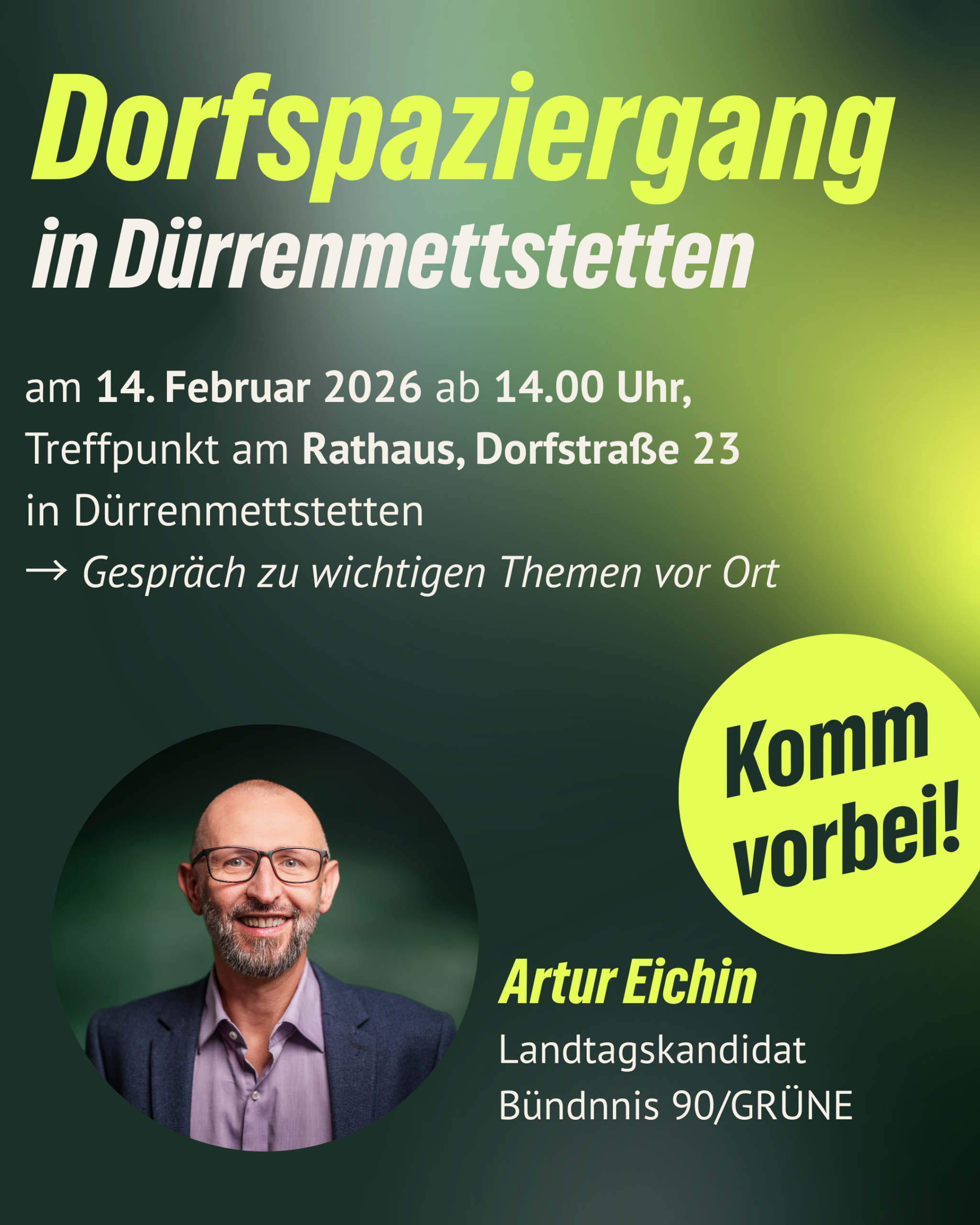 Artur Eichin, unser Landtagskandidat im Kreis Rottweil, lädt am 14. Februar um 14 Uhr zum Dorfspaziergang nach Dürrenmettstetten. Treffpunkt ist am Rathaus, Dorfstr. 23. Die Gemeinde mit ihren 540 Einwohnern hat einiges zu bieten, darunter den erst im vergangenen Jahr eröffneten Lebenshof mit Wohnraum für bis zu 25 Senioren. Aber auch der frisch renovierte Kindergarten, die drei Hofläden, Bio- und Handwerksbetriebe, Vereine und eine gute Jugendarbeit machen die Gemeinde attraktiv. Artur Eichin wird auch Windkraft und Fernwärme in den Fokus nehmen und sich ein Bild von wichtigen Themen, laufenden Projekten und möglichen Handlungsbedarfen machen. Sie sind herzlich eingeladen!